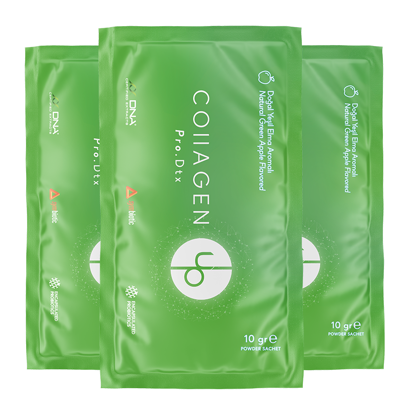 COllAGEN UP Pro. Dtx kolajen içerikli tek detoks takviyesi olma özelliği ile öne çıkan çok yönlü eşlikçinizdir. Yeşil elma aromalı egzotik lezzeti, biyoaktif kolajen peptit karışımı, kapsüllenmiş probiyotikler ve güçlü detoksifiye edici bileşenleri ile sadece bağırsak sağlığınızı desteklemekle kalmaz, aynı zamanda cildinizin parlaklığını artırır ve yaşlanma etkileriyle mücadelede yardımcı olur.